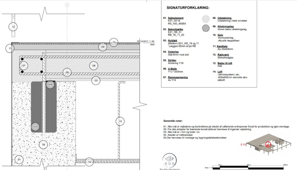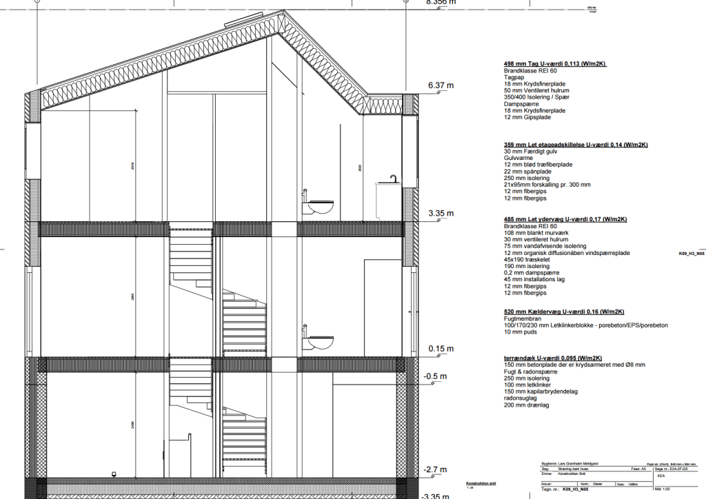 Et konstruktionssnit dokumenterer materialevalg, lag og tekniske detaljer i konstruktionen. Vi udarbejder nøjagtige tegninger, der giver entreprenører og myndigheder det fulde overblik.